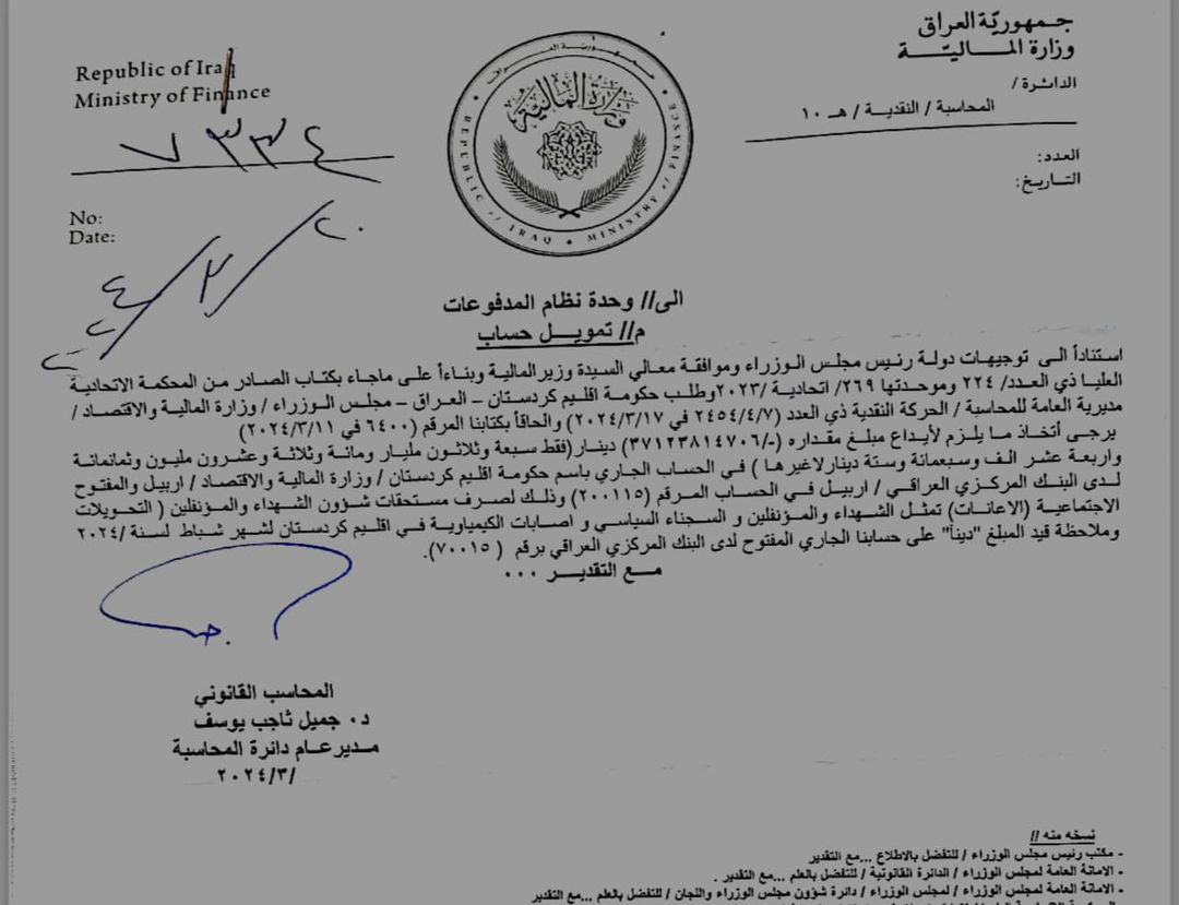 ئەمڕۆ دووشەممە 20ی ئاداری 2024 وەزارەتی دارایی عێراق نووسراوێکی ئاراستەی یەکەی سیستمی خەرجکردنی وەزارەتەکەی کردووە، تێیدا هاتووە، "بڕی 37 ملیار و 123 ملیۆن و 814 هەزار و 706 دینار بخرێتە سەر هەژماری حکومەتی هەرێمی کوردستان.