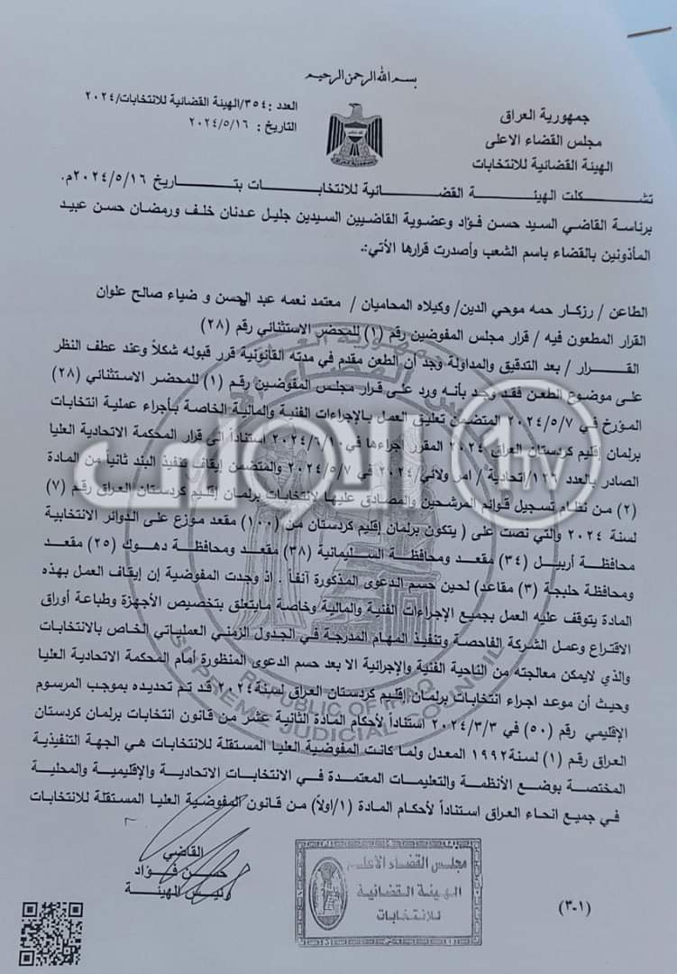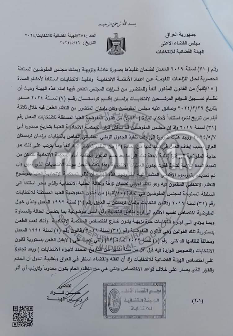 هەروەها ئاماژە بەوەشکراوە، دهستهی دادوهریی ههڵبژاردن، كۆمسیۆنی ههڵبژاردنهكانی عێراق پابهند دهكات بهوهی دهست به رێوشوێنهكانی بكاتهوه بۆ سازدانی ههڵبژاردنی كوردستان.