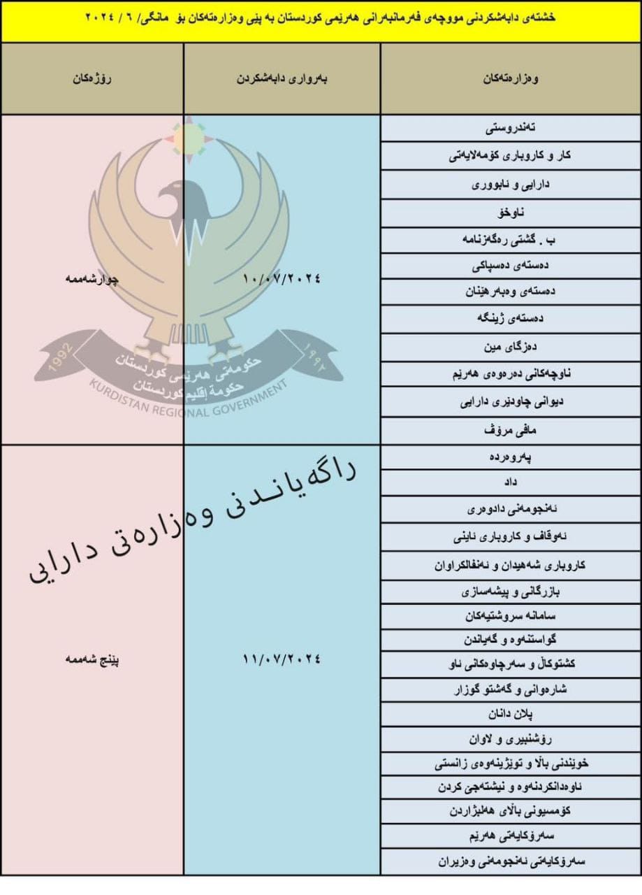 ئەمڕۆ سێشەممە 9ی تەموزی 2024، وەزارەتی دارایی و ئابووریی هەرێمی کوردستان رایگەیاند، "رۆژی چوارشەممە ڕێکەوتی 10ی تەموزی 2024 بەوەزارەتی تەندروستی دەست بەدابەشکردنی مووچەی مانگی حوزەیرانی فەرمانبەرانی هەرێمی کوردستان دەکرێت و ڕۆژی پێنجشەممە 11ی تەموزی 2024 بە سەرۆکایەتی ئەنجومەنی وەزیران کۆتایی دێت".