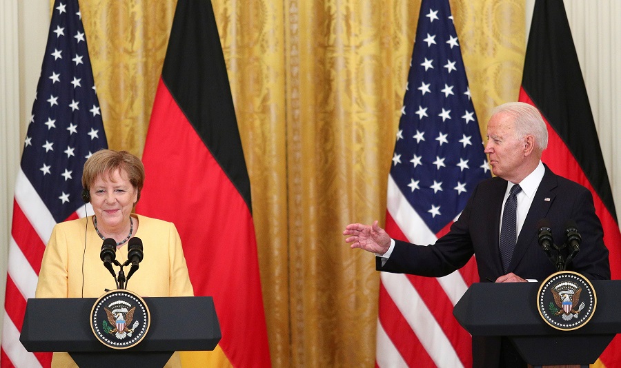 هاوڵاتى سهرۆکى ویلایهته یهکگرتووهکانى ئهمریکا و راوێژکارى ئهڵمانیا لهکۆشکى سپى کۆبونهوه و تێیدا بهڵێنیاندا روبهڕوى ههڕهشهکانى روسیا ببنهوه. ئهنگێلا مێرکڵ راوێژکارى ئهڵمانیا سهردانى ئهمریکاى کرد و لهگهڵ جۆ بایدن سهرۆکى ئهمریکا کۆبوهوه، دواتر لهکۆنگرهیهکى رۆژنامهوانیدا ئاشکرایانکرد که ههردوولا بهڵێنیانداوه پێکهوه بۆ روبهڕوبونهوهى ههڕهشهکانى روسیا کار دهکهن. ههروهها ئهوهشیان راگهیاند که پێکهوه شانبهشانى یهک دژى ههنگاوه نادیموکراسییهکانى چین بوهستن و بۆ ئهو بابهتانهش باسیان لهگرنگى هاوپهیمانێتى ئهمریکا و ئهڵمانیا کرد. لهبارهى پرۆژى بۆڕى گازى (Nord Stream 2)، جۆبایدن رایگهیاند:" نابێت وزه وهک چهکێکى سیاسى دژى وڵاتان بهکاربهێنێت". لهبهرامبهردا، ئهنگێلا میرکڵ سور بوو لهسهر ئهوهى ئهو پرۆژهیه له ئهڵمانیا بڕیارى لهسهر دراوه و بهردهوامدهبن. دواى کۆبونهوهکهش بایدن ئاماژهى بهوه کرد هاوپهیمانهکانیش لهسهر ههندێک شت هاوڕا نین، ئاماژهى بهوهش کردوه ئهڵمانیا دڵنیایى دهدات لهسهر ئهوهى که روسیا ئهو پرۆژهیه وهک چهکێک بهکارنههێنێت.