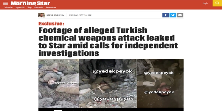 هاوڵاتى ڕۆژنامەیەكی بەریتانی وێنەی سێ گەریلای شەهیدی بڵاو کردووەتەوە وەک بەڵگەی بەکارهێنانی چەکی کیمیاوی تورکیا دژی کورد كەلە بۆردومانەكانی ئەم دواییەدا بەكاریهێناوە. ڕۆژی 16ئایاری 2021 ڕۆژنامەی ‘مۆڕنینگ ستار’ی بێریتانی وێنەی سێ گەریلای شەهیدی بڵاو کردووەتەوە، کە لە ئاڤاشین بە چەکی کیمیاوی شەهید بوون و ڕایگەیاندووە، کە ئەمە چەندین جارە تورکیا لە دژی کوردان چەکی کیمیاوی بەکار دێنێت و دونیا بێدەنگە. ڕۆژنامەکە چەند وێنە و دیمەنێکی گەریلای شەهیدی لە ئاڤاشین پیشانداوە، کە ڕۆژی ٣ی ئەم مانگە (ئایار) شەهید بوون و وەک باسی کردووە، هیچ ئاسەوارێکی برینداربوون لە سەر تەرمی گەریلاکان نابینرێت و پشتڕاستی دەکاتەوە، کە سوپای تورک چەکی کیمیایی لەدژی گەریلاکان بەکار هێناوە و بەوشێوازە شەهیدیی کردوون. هەروەها ڕۆژنامەکە دەستنیشانیکردووە، کە سەربازانی تورکیا تەرمی ژنە گەریلایەک کە وادیارە لە تونێلێکی ژێر زەومینیدا شەهید بووە دێننە دەرەوە و لە قسەکانیاندا بەکارهێنانی چەکی کیمیاوی لە دژی گەریلاکانی کوردستان لە یەکتر پیرۆز دەکەن. مۆڕنینگ ستار بەبیریهێناوەتەوە، کە بەڕێوبەرانی کەجەکە و پەکەکە چەندینجار هۆشداریان داوە لە بەکارهێنانی چەکی کیمیایی لەلایەن دەوڵەتی تورکەوە، کە پێچەوانەی پەیمانی ١٩٩٧ی پێشگرتن لە بەکارهێنانی چەکی کیمیاییە کە تورکیاش واژۆی لەسەر کردووە. ڕۆژنامەی مۆڕنینگ ستار هاوکات سەرنجی ڕاکێشاوەتەسەر ئەوەی، کە ئەمە جاری یەکەم نییە کە دەوڵەتی تورک لە دژی کوردان چەکی کیمیایی بەکاردێنێت، بەڵکو لە دژی شەنگال و کامپی پەنابەرانی مەخموریش بەکاریهێناوە، هەروەها ساڵی ٢٠١٩ لە سەرێکانی دەوڵەتی تورکیا چەکی قەدەغەکراوی فسفۆڕی لە دژی کوردان بەکارهێنابوو، بەڵام لەدژی ئەم پێشلکاریی و تاوانەی دەوڵەتی تورک تا ئێستا ڕای نێودەوڵەتی بێدەنگی هەڵبژاردووە.